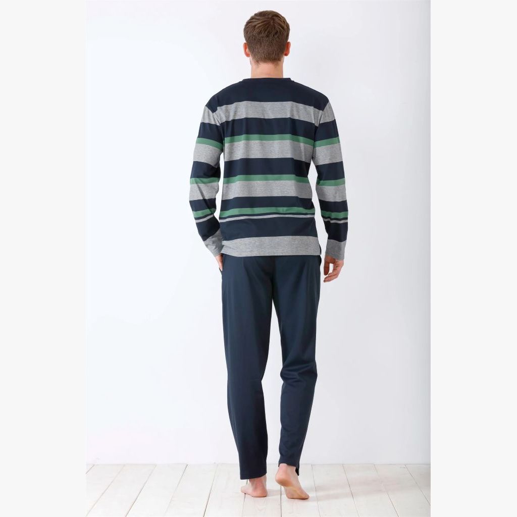 HAJO Miesten pyjama. Raidallinen paita, jossa O-pääntie ja rintatasku. Housut yksiväriset. Suorat lahkeet, helma ja hihansuut. Taskut housuissa sekä kiristysnyöri vyötäröllä.