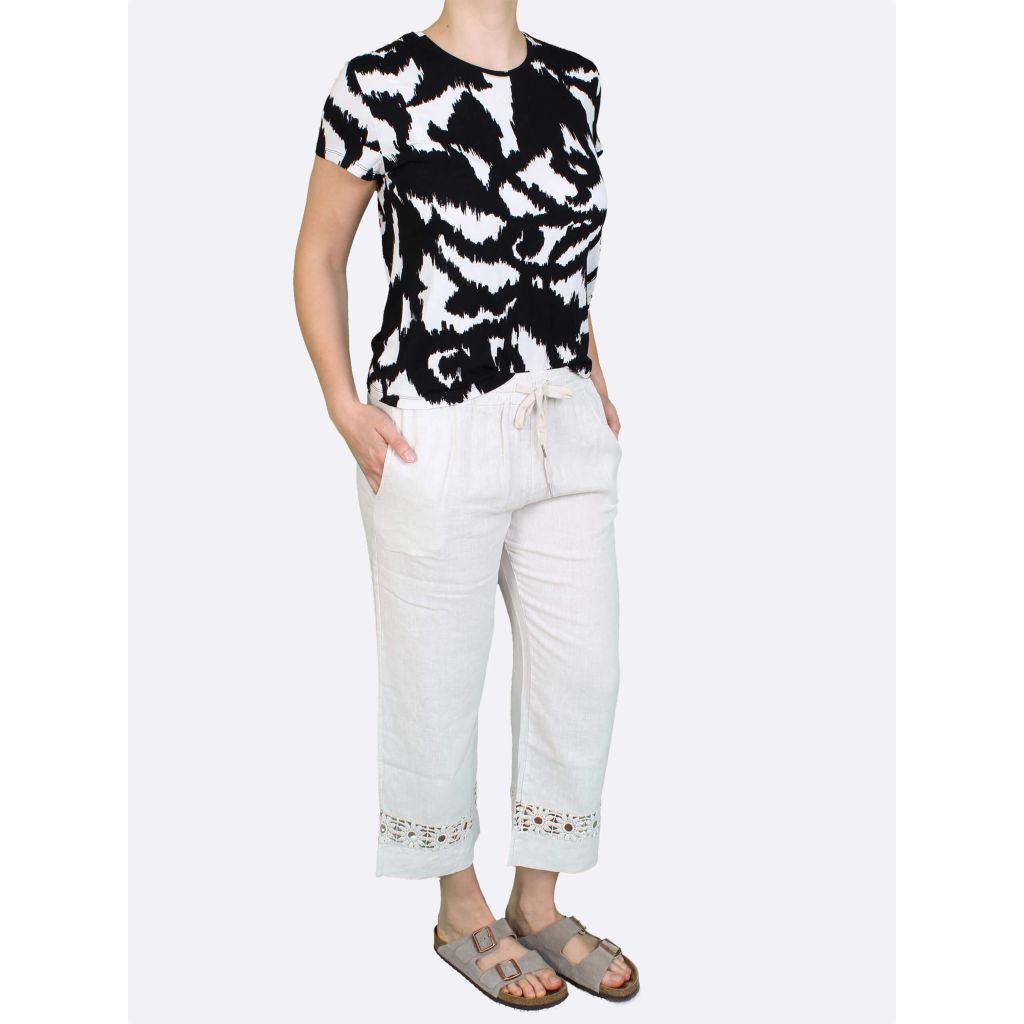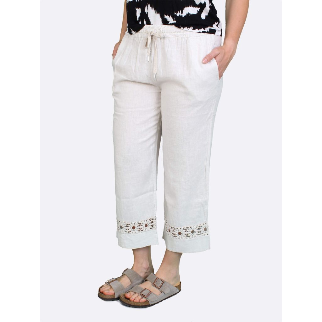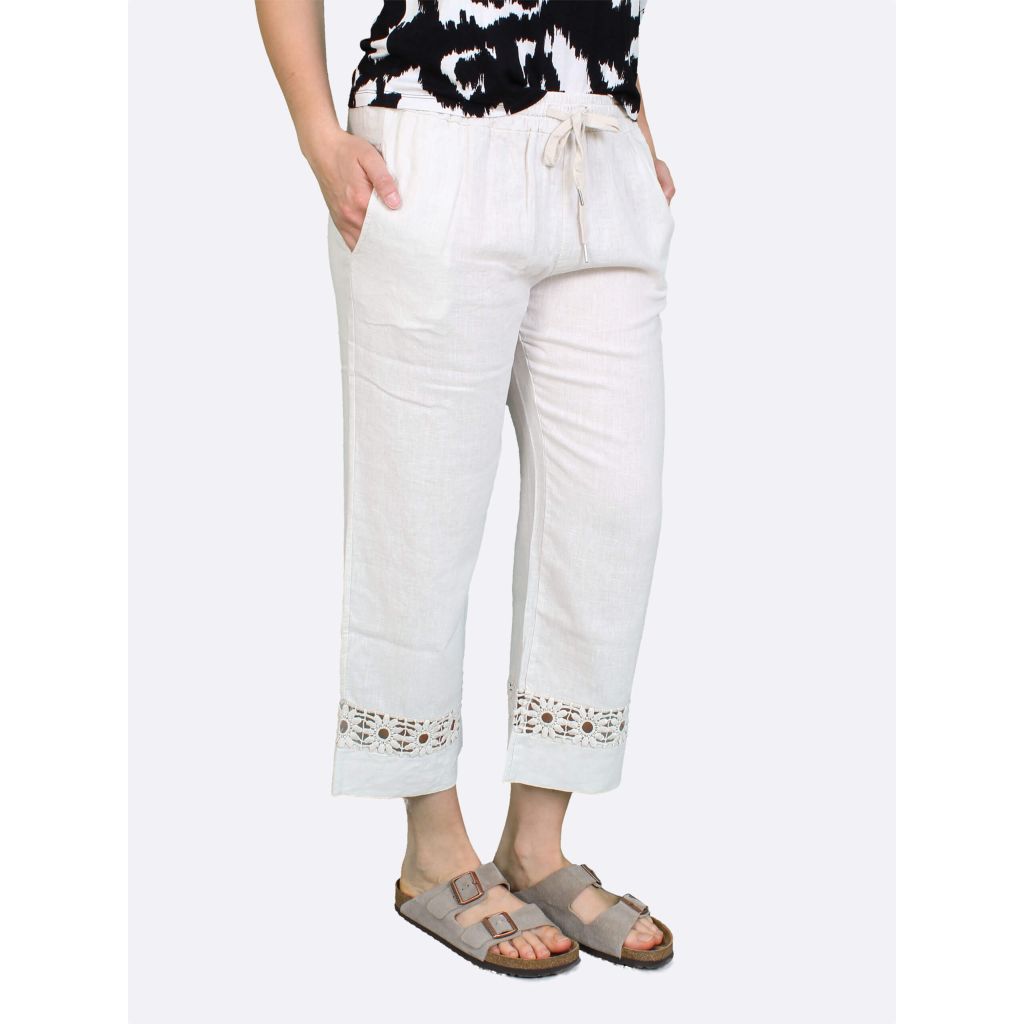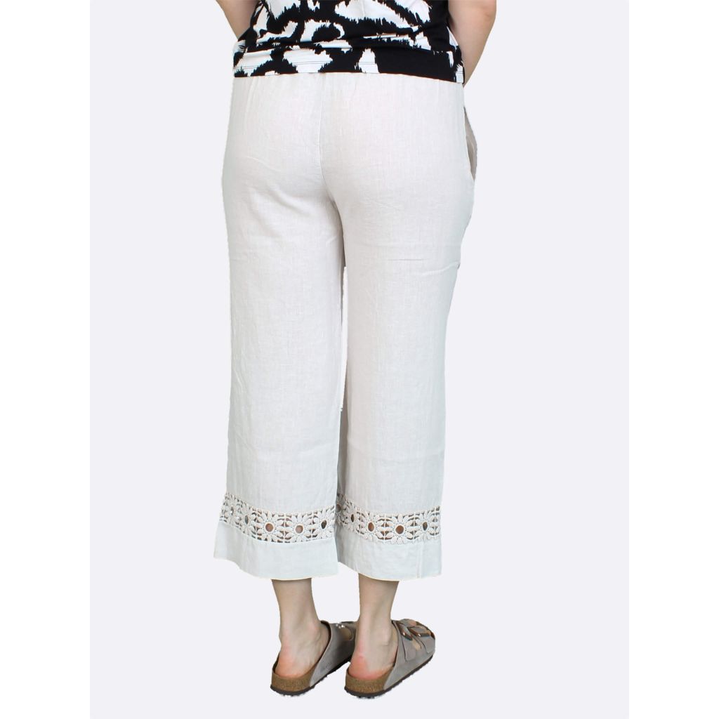 ANNA MENOTTI Kevyet housut. Väljät, leveät lahkeet. Lahkeissa pitsikuvio. Joustava kuminauhavyötärö. Sivussa taskut.