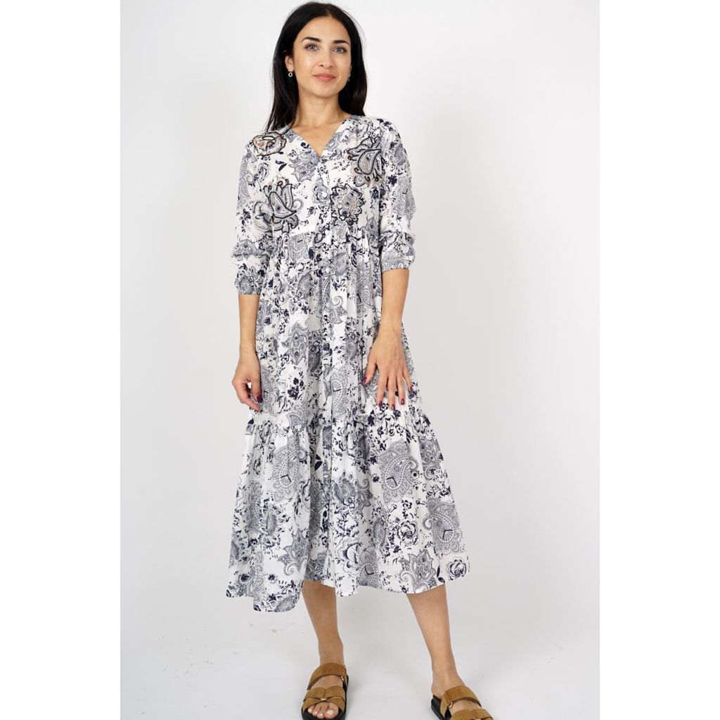 M.X.O kuvioitu mekko. Pitkä malli. 3/4 hihat. V-pääntie. Napit edessä.