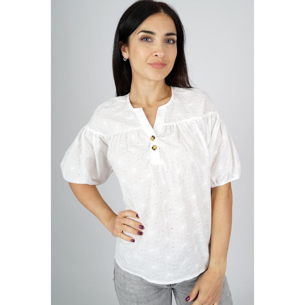 M.X.O kukkakuosinen pusero. Takaosa sileää neulosta. V-kaulus, jossa napit. Pussimaiset hihat. Laskokset edessä.