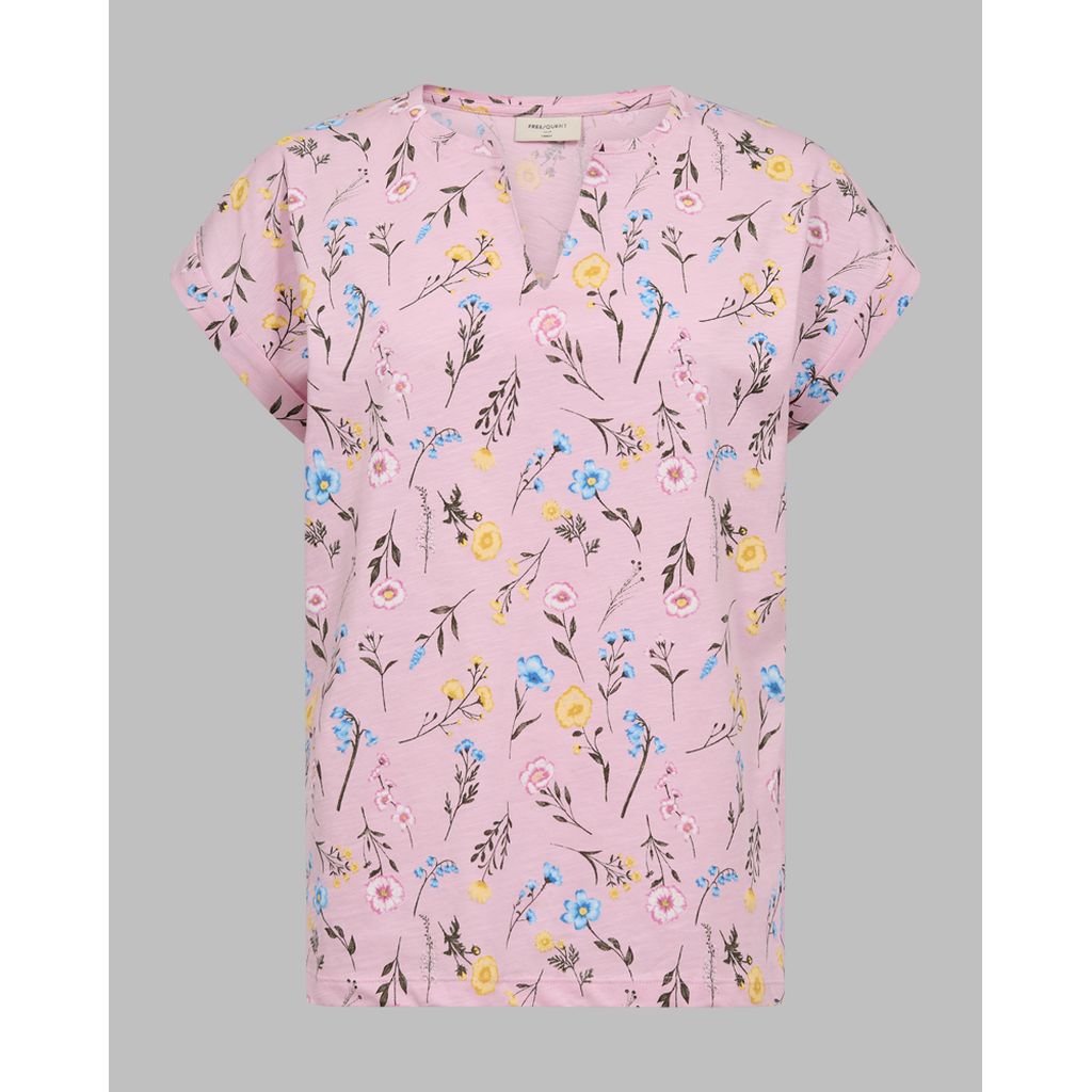 FREEQUENT FQVIVA Naisten kukkakuvioinen T-paita. V-kaula-aukko. Käännetyt hihansuut.