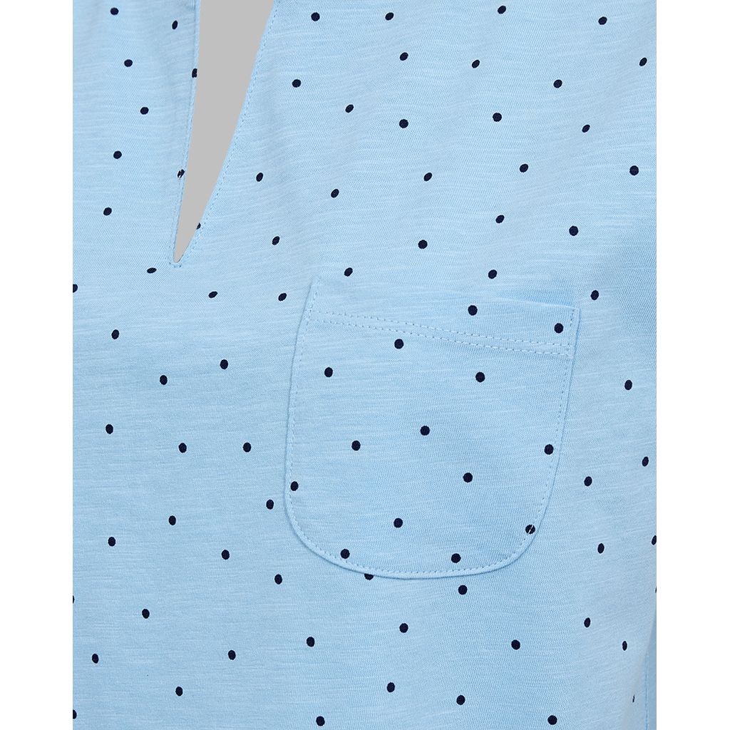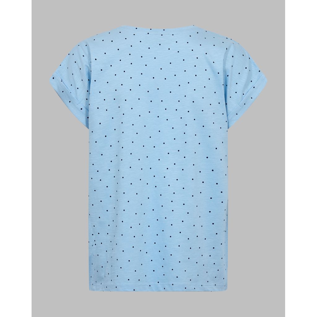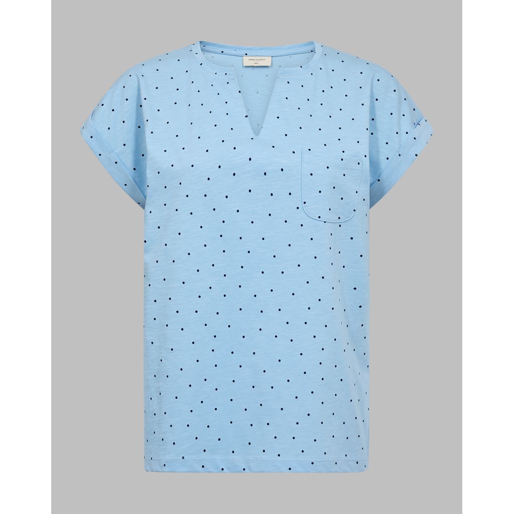 FREEQUENT FQVIVA Naisten pilkkukuvioinen T-paita. V-kaula-aukko. Käännetyt hihansuut. Rintatasku.