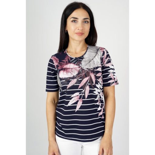 GABRIELLA lehtikuvioinen t-paita, jossa edessä hopeisia kimalleniittejä. O-pääntie.