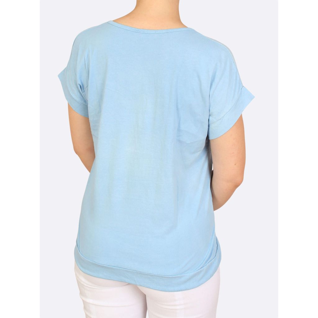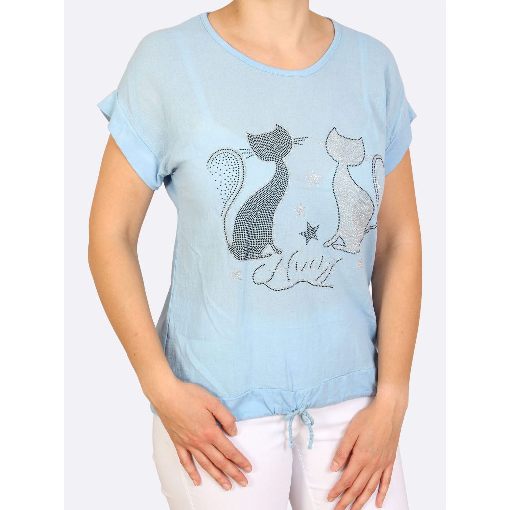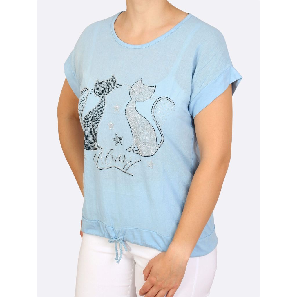 LEA H trikoopaita. Edessä kimalteleva strassikissakuvio. Helmassa kiristettävä nyöri.
