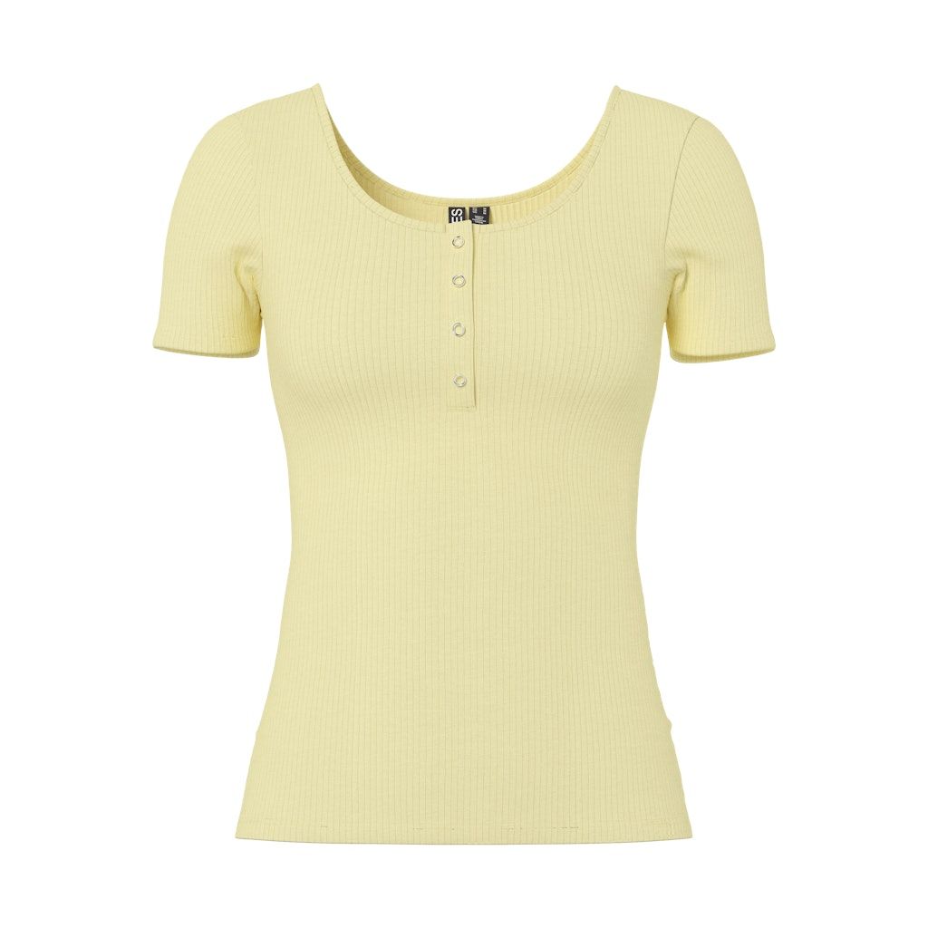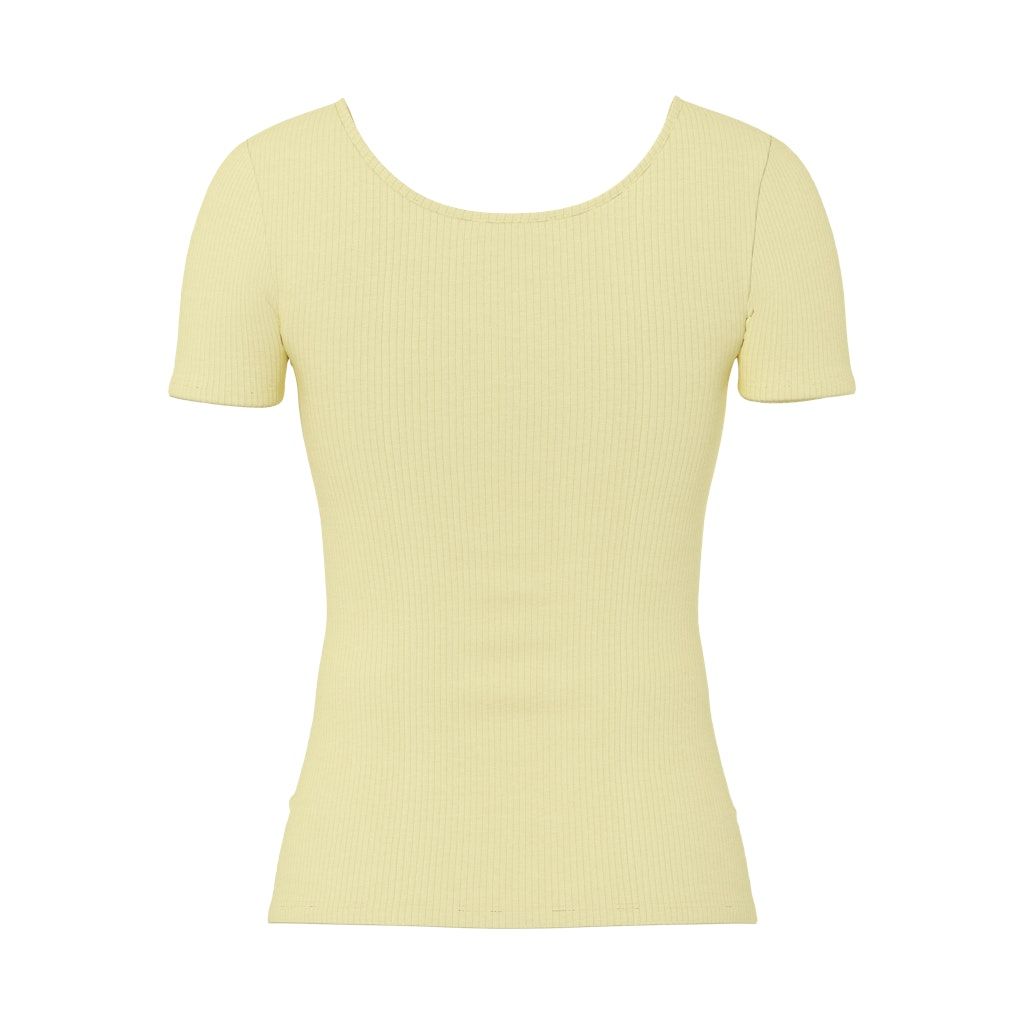Pieces naisten ribbineuloksinen T-paita. Slim fit -mallinen, erittäin joustavaa kangasta, valmistettu luomupuuvillasta. Pyöreä avara pääntie edessä ja takana, edessä neppilista.