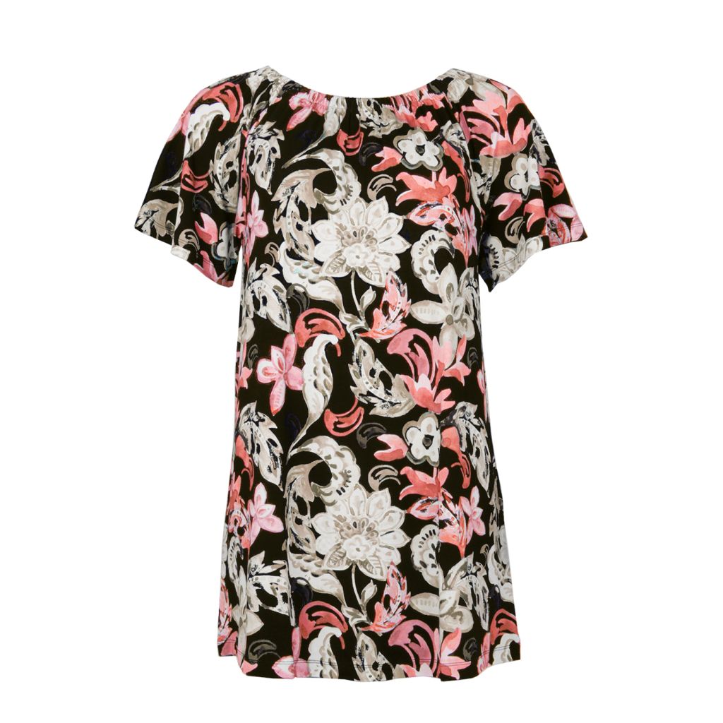 STI SAMUELLE trikootunika kukkaprintillä. Venepääntie, jossa joustava kuminauha. Miellyttävää viskoosia.