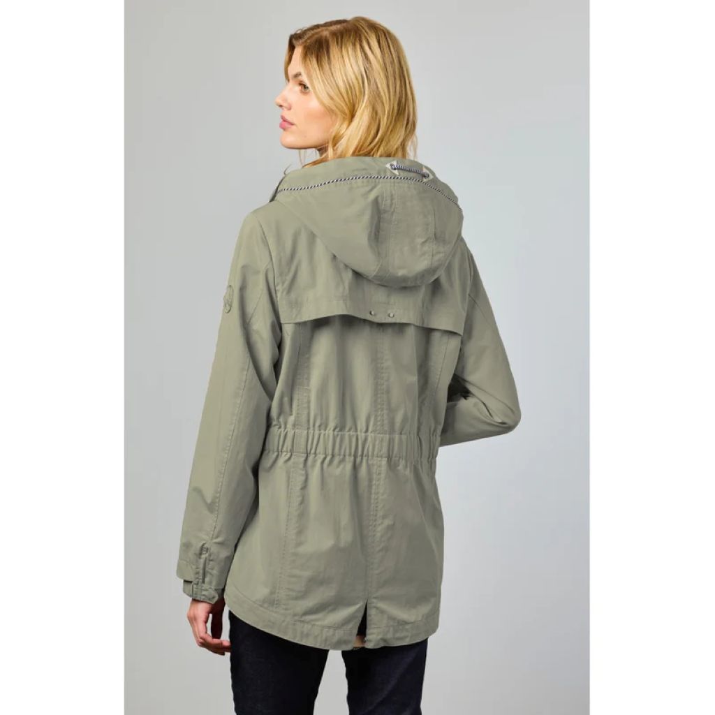 JUNGE takki jossa kiinteä huppu. Vetoketju kiinnitys. 2 taskua vetoketjulla sekä povitasku.
