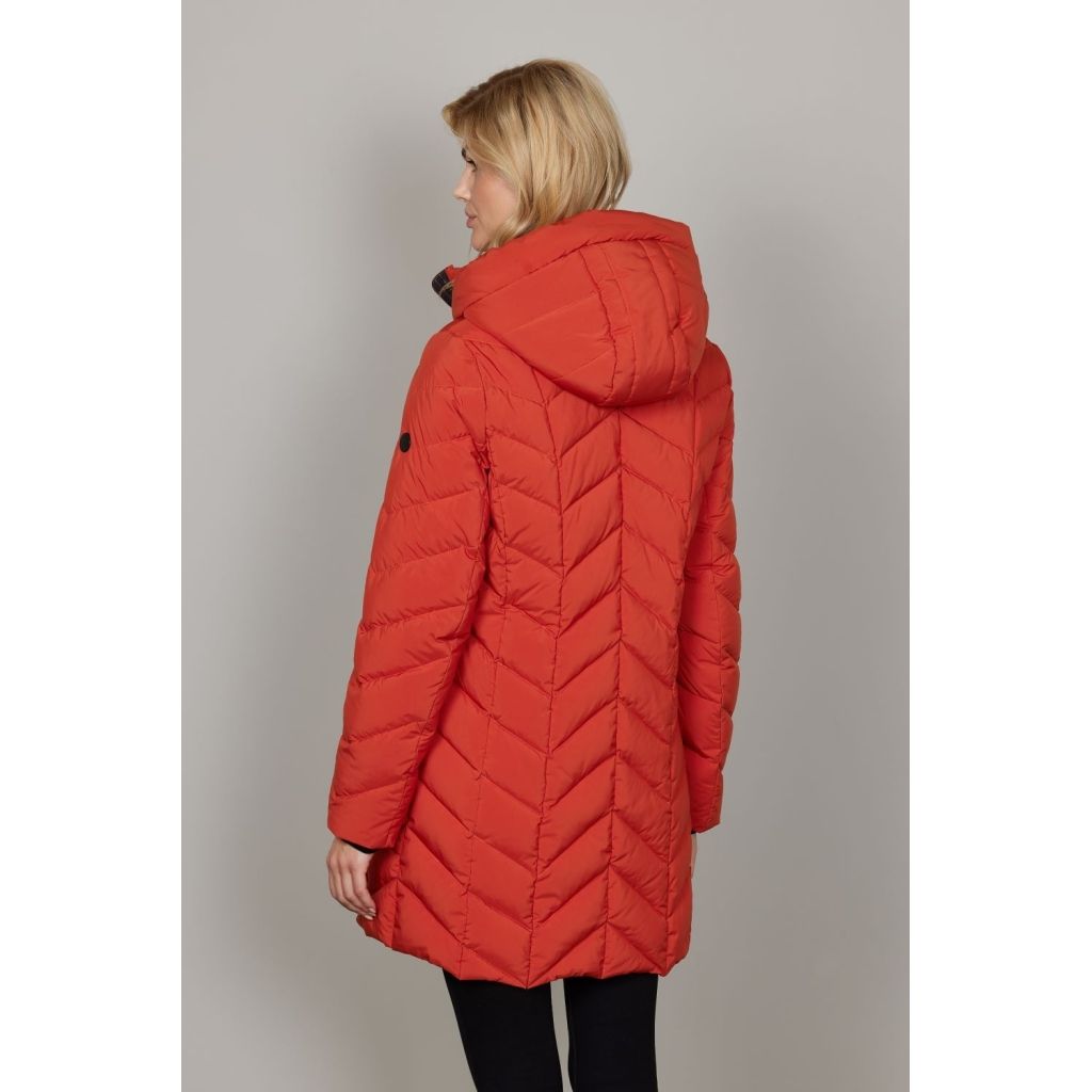 JUNGE Naisten pehmeä takki. Lämmin ja kevyt soronatäyte. Irrotettava huppu kiristysnauhalla. Kaksisuuntainen vetoketju edessä. Vetoketju taskut.