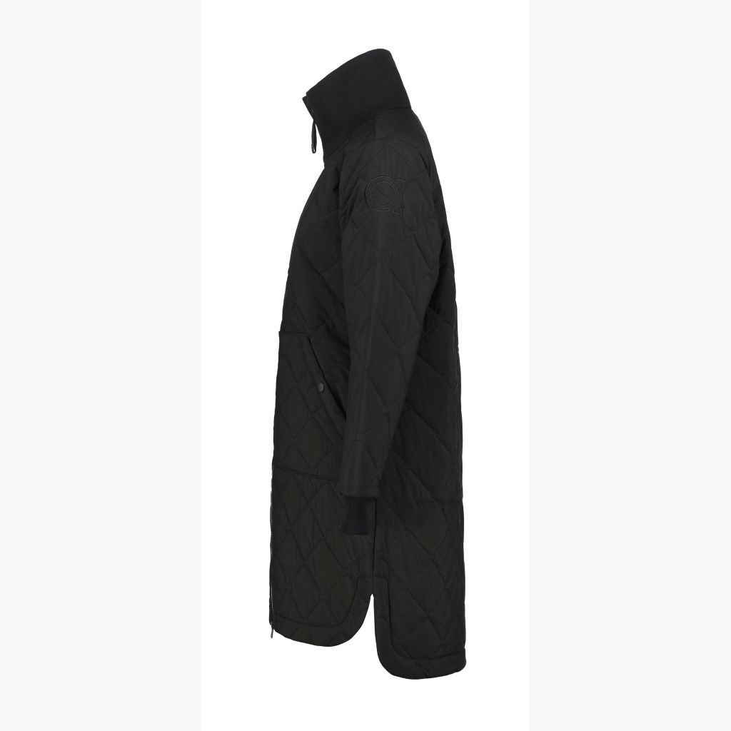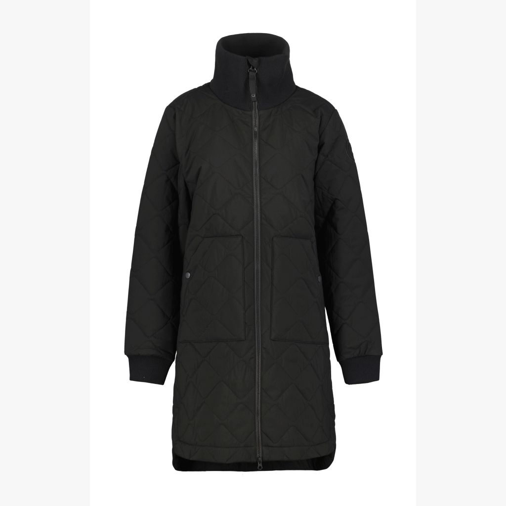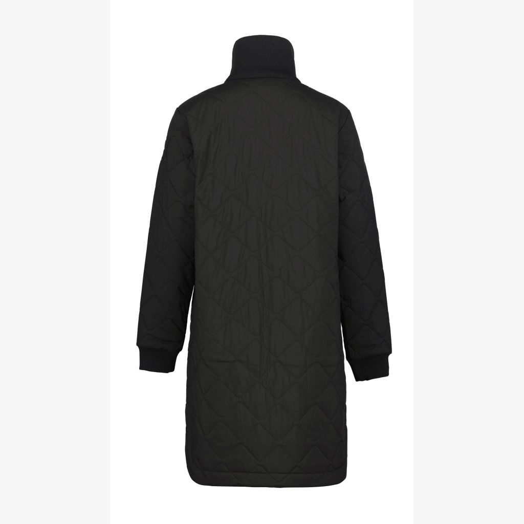 TORSTAI HAIKARILA Naisten pitkä tikkitakki. Kaksisuuntainen vetoketju edessä. Kaksi napillista etutaskua. Joustavat neuleresorit. Halkiot helmassa. Vettä hylkivä ja tuulta pitävä.