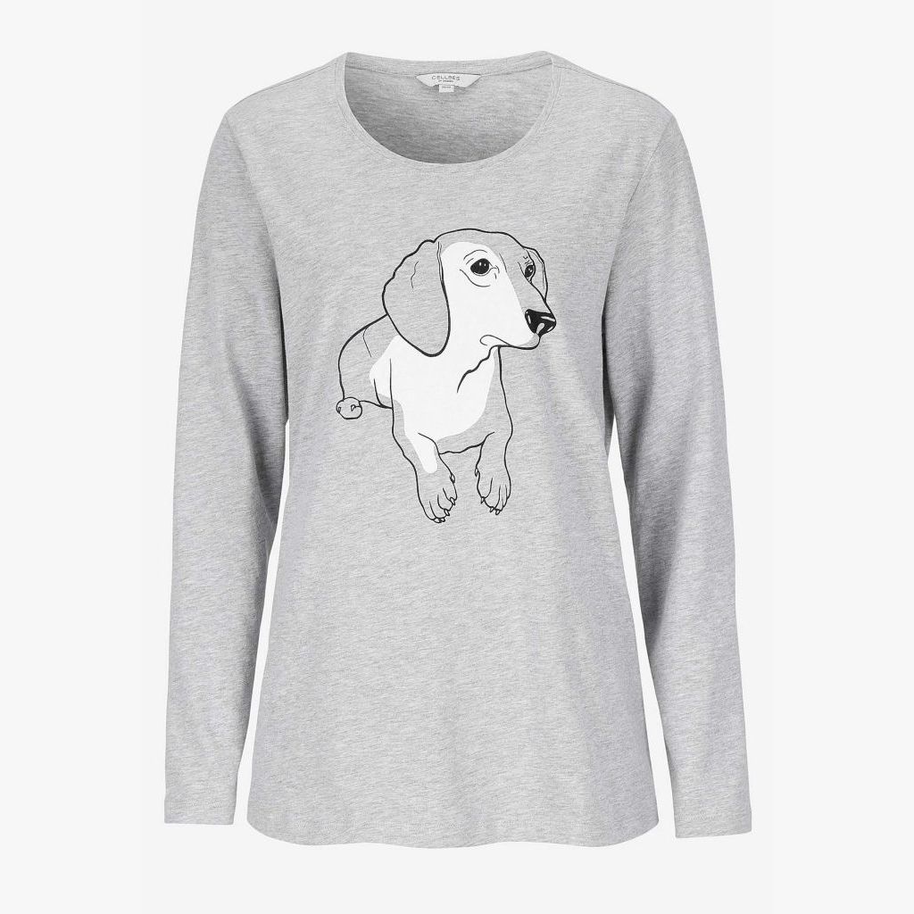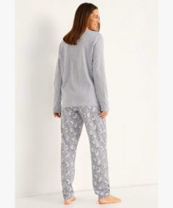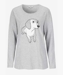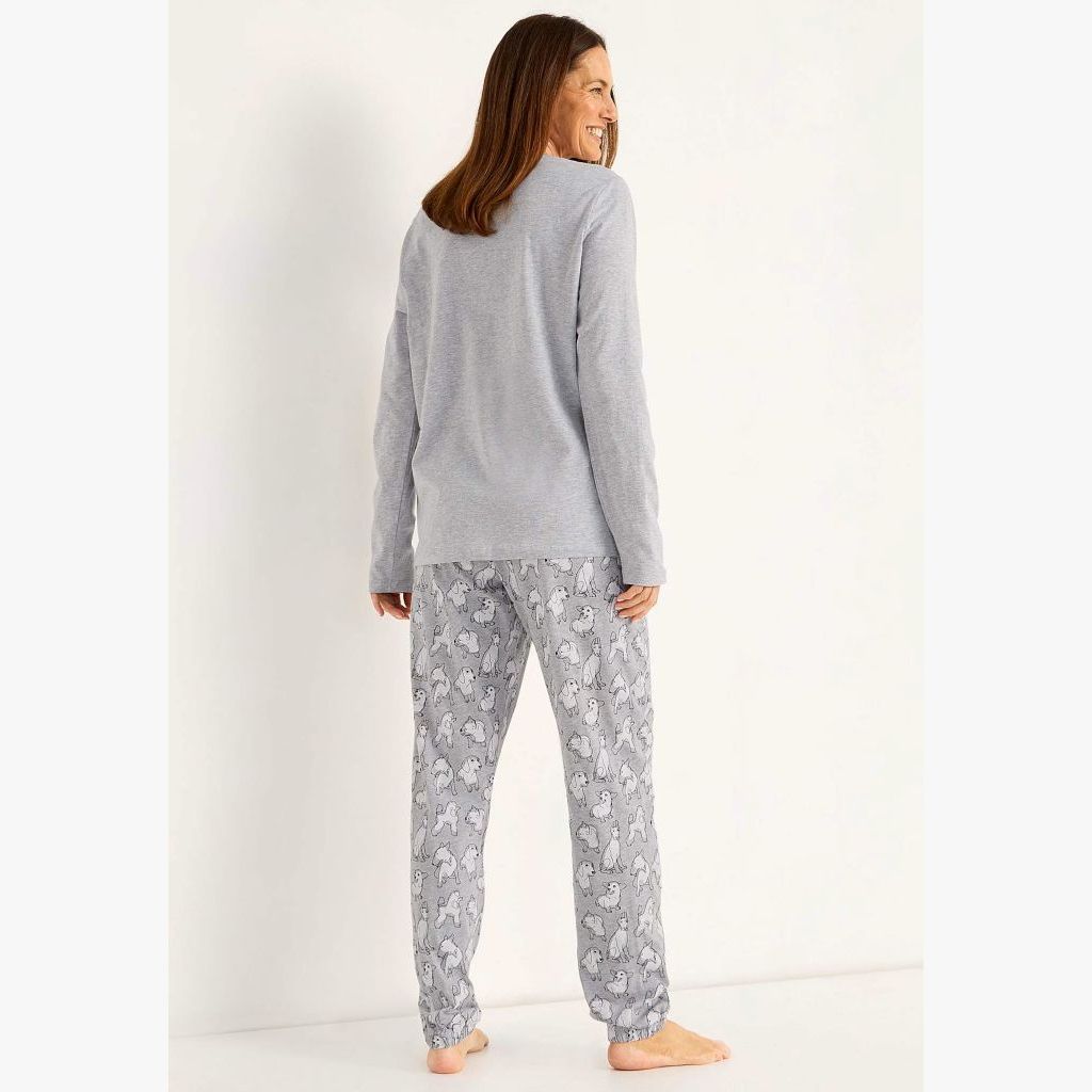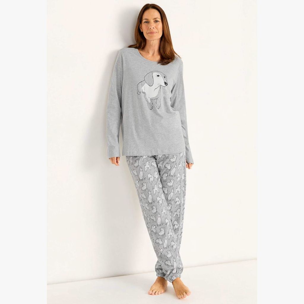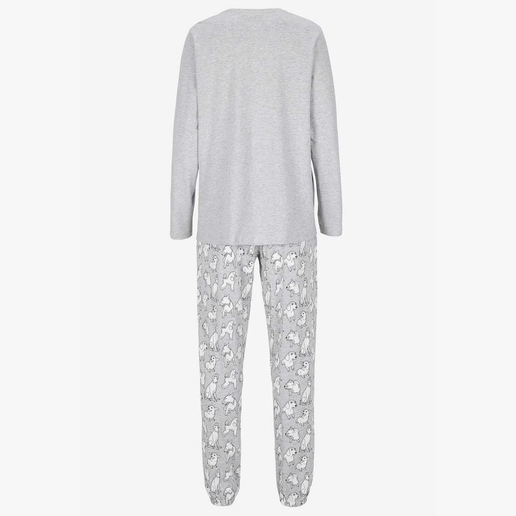 Naisten koirapyjama pitkillä hihoilla. Housut ovat täyspitkät, kuminauhavyötärö ja taskut. Lahkeissa kuminauhat.