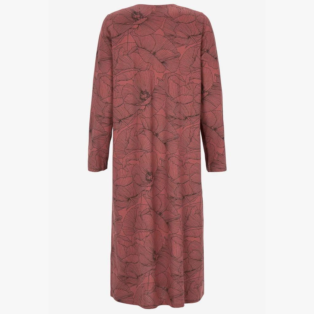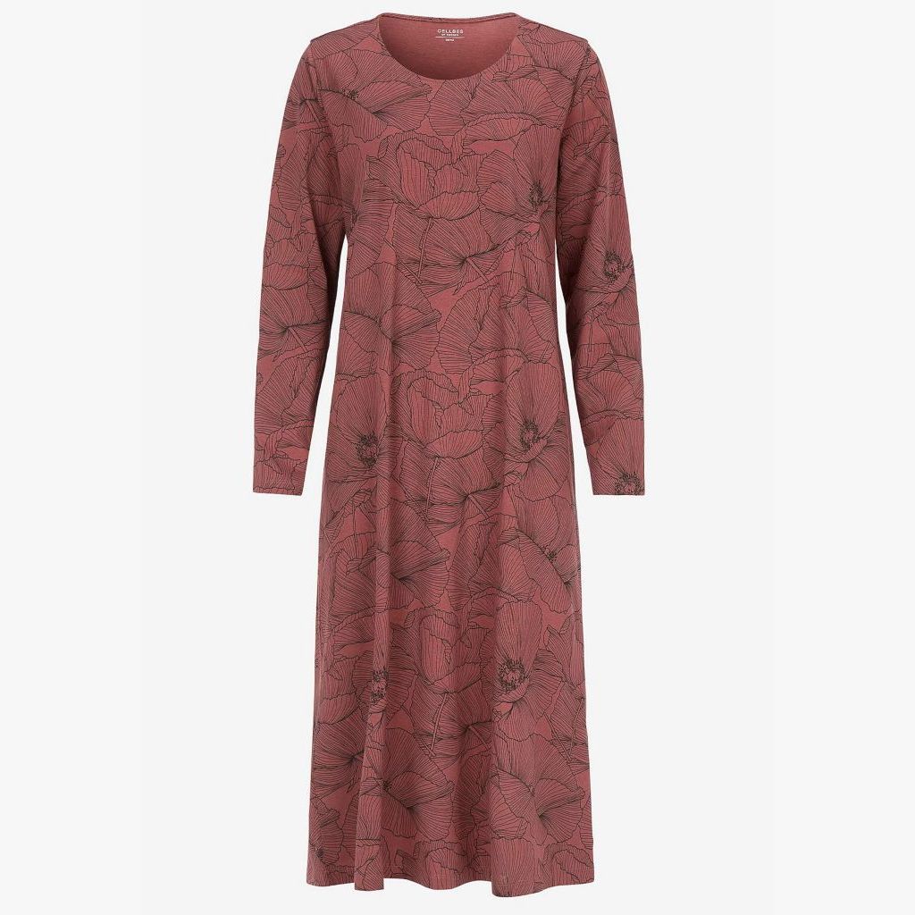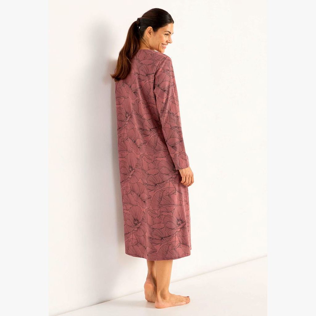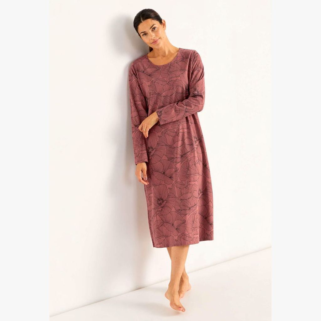 Naisten kukkakuvioinen yöpaita pitkillä hihoilla ja pyöreällä pääntiellä.