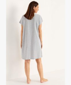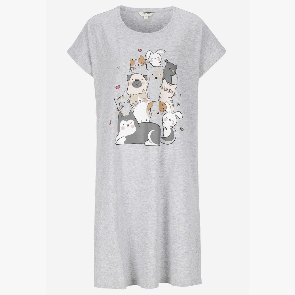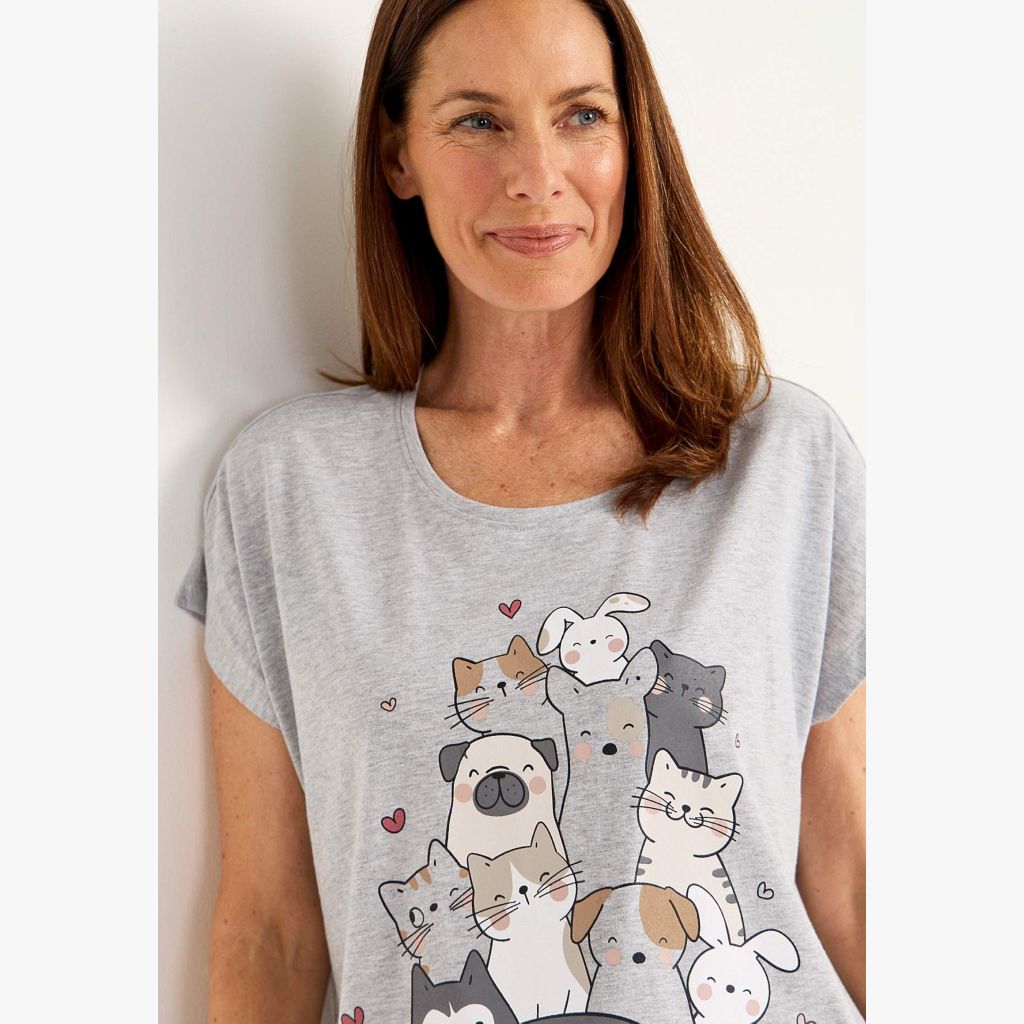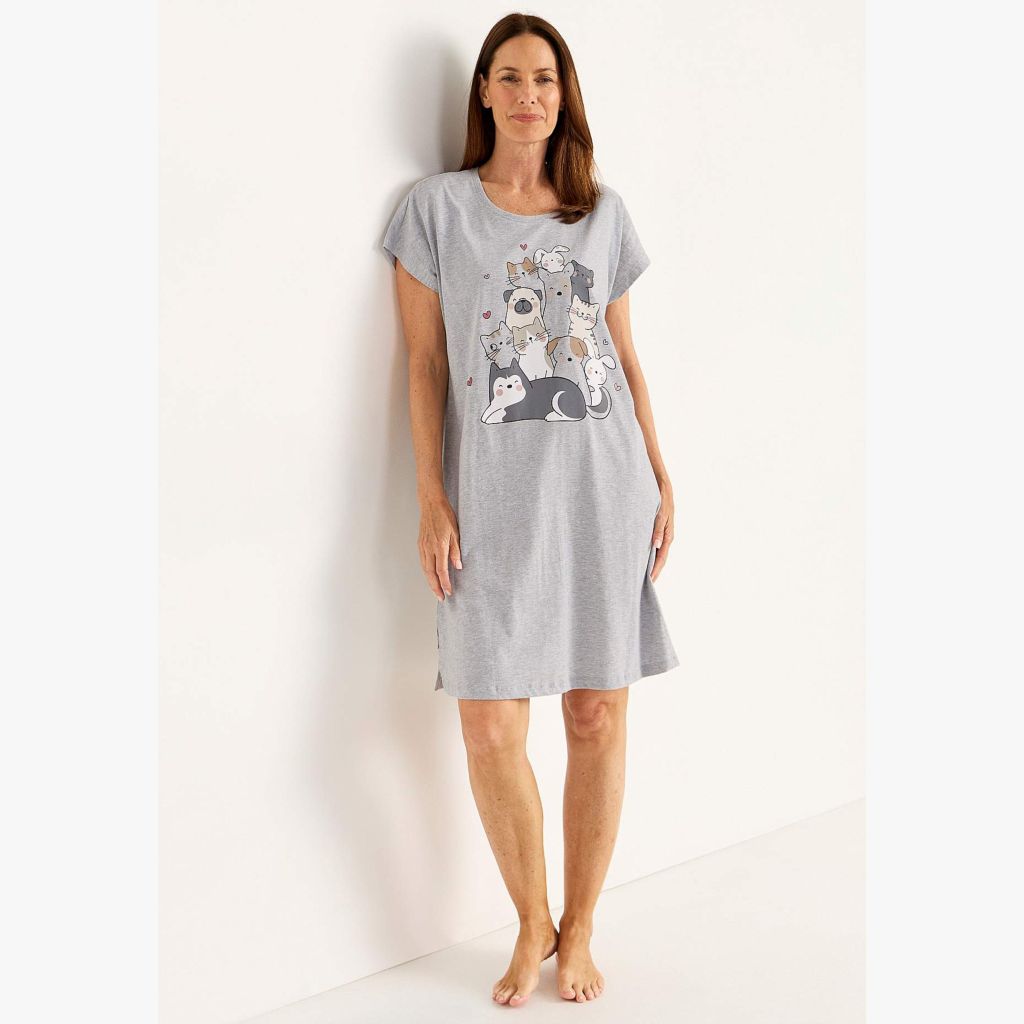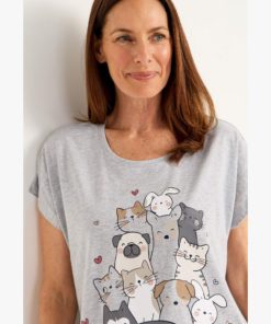 Naisten kissakuvioinen yöpaita lyhyillä hihoilla ja pyöreällä pääntiellä.
