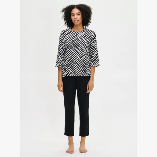 NANSO KAISLI Naisten kuosillinen pyjama 3/4 hihoilla ja pyöreällä pääntiellä. Yksiväriset housut ovat 7/8 mittaiset. Materiaali on laadukasta, iholla miellyttävän pehmeältä tuntuvaa ja helppohoitoista puuvilla-modaalia, joka pysyy hyvänä pesusta toiseen.