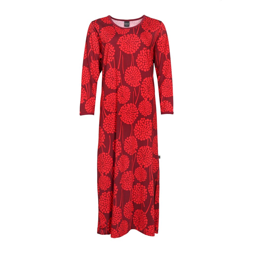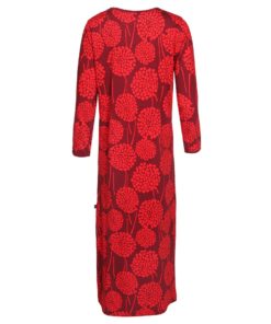 RATIA DAALIAT Naisten kuosillinen, pitkä yöpaita pitkillä hihoilla ja pyöreällä pääntiellä. Helmassa halkio. Materiaali on pehmeää puuvillaa.